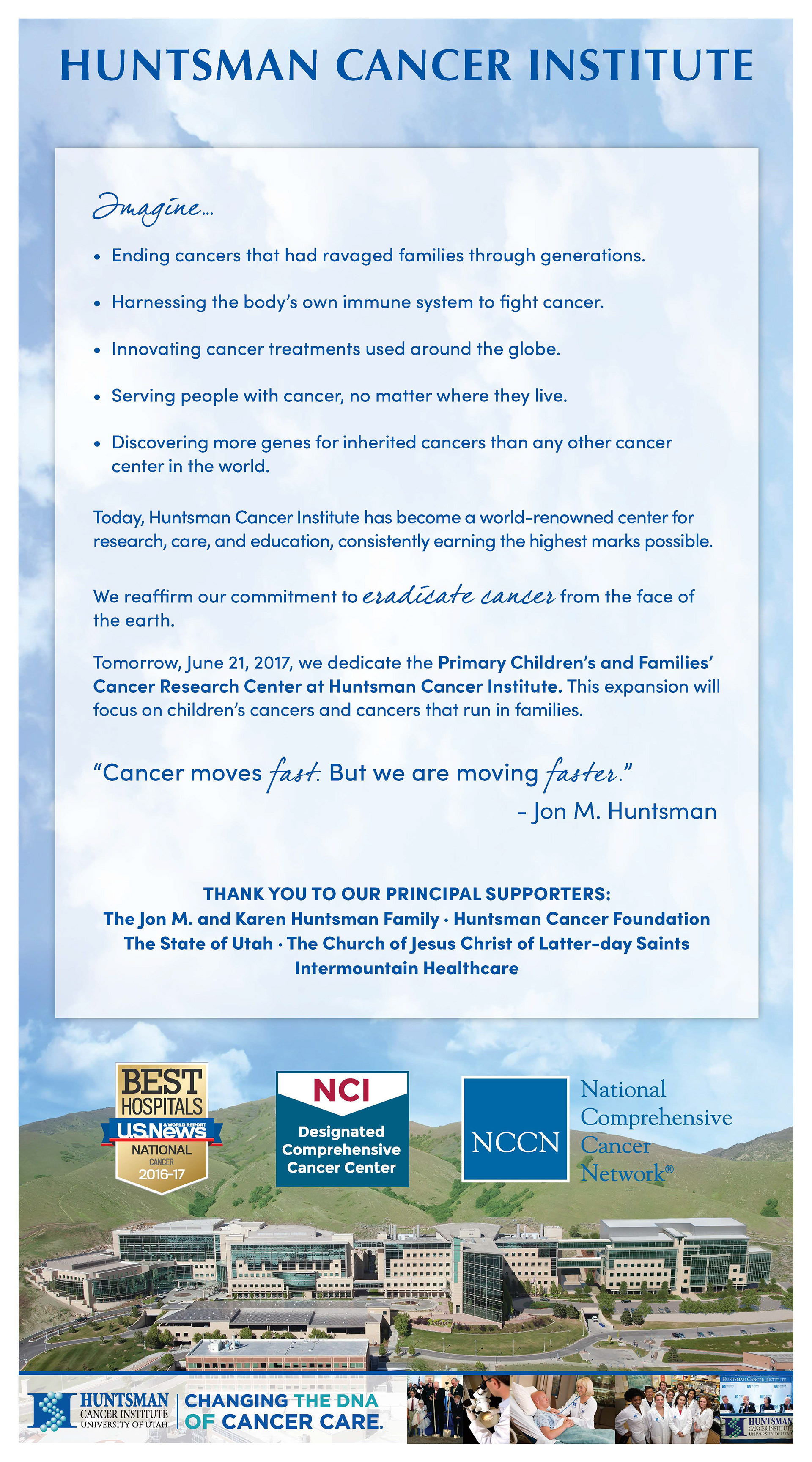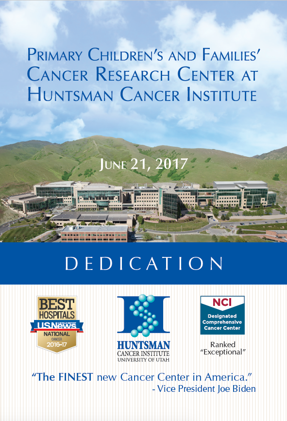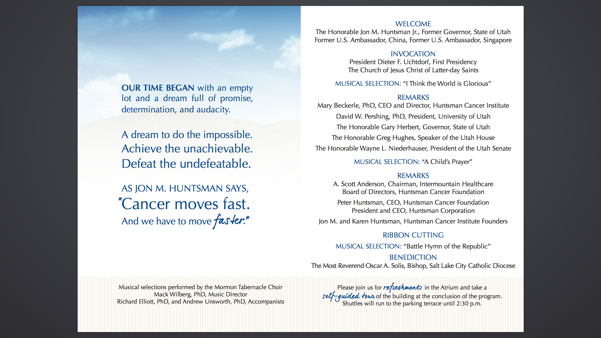 Grand opening ceremony and building tour materials for the major research expansion of Huntsman Cancer Institute (HCI).